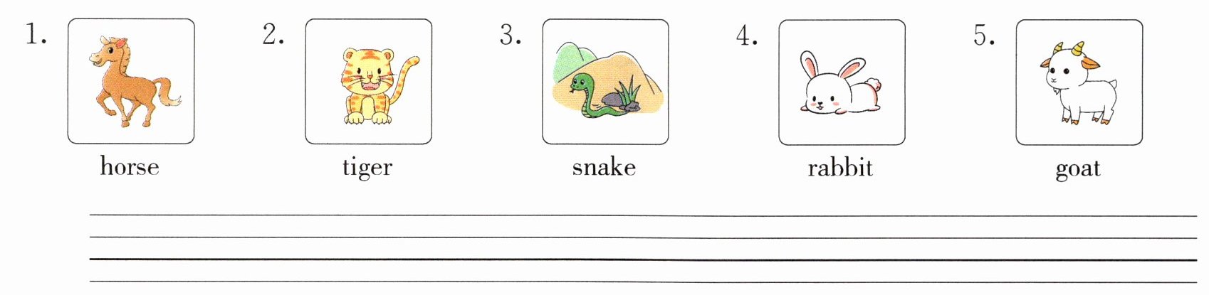 小动物们正在参加一场动物联欢会,请根据名字的首字母在字母表中的顺序决定小动物的出场顺序,将首字母大小写写在四线三格上。