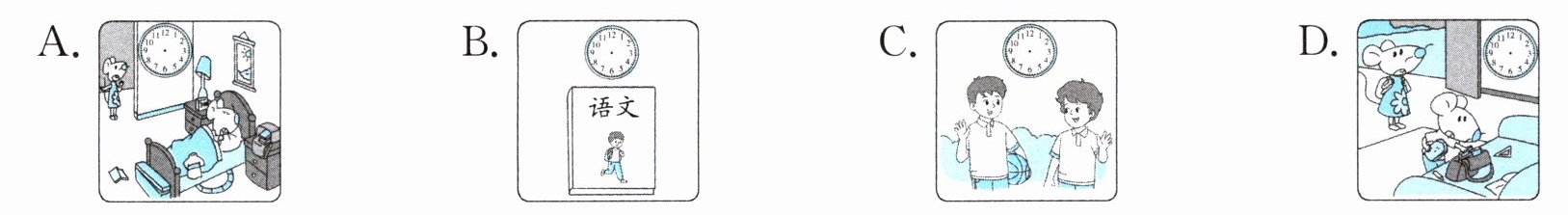 二 读句子或对话,选择正确的图片,并在钟面上画出对应的时间。