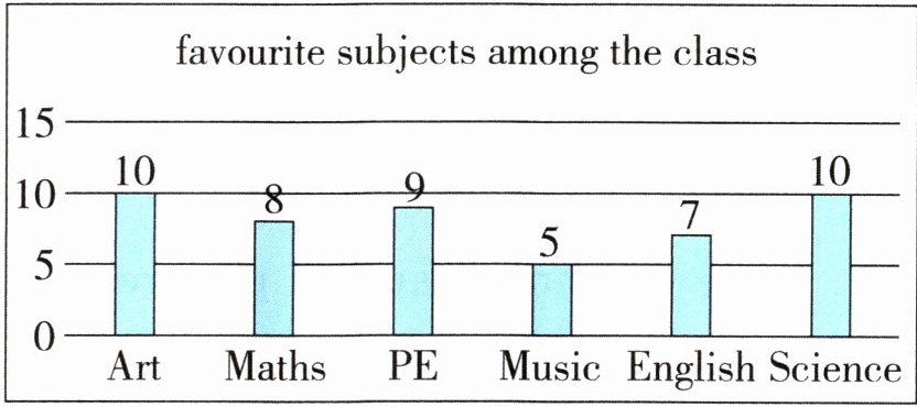 六、新趋势学科融合 Liu Tao 调查了班级同学最喜欢的课程并绘制了一张图表。请根据图表信息,判断下列句子的正(T)误(F)。