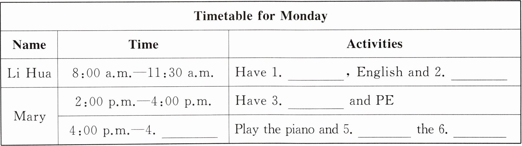 (五)星期一总是繁忙的一天。根据李华和朋友 Mary 的交流,完成时间表。