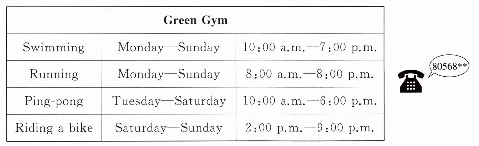 )3. Li Hua can swim ______ in the gym.A. at eight in the morning B. at nine in the evening C. at four in the afternoon