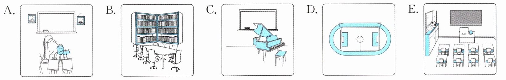 1. classroom; E 2. music room; C 3. art room; A 4. library; B 5. playground; D