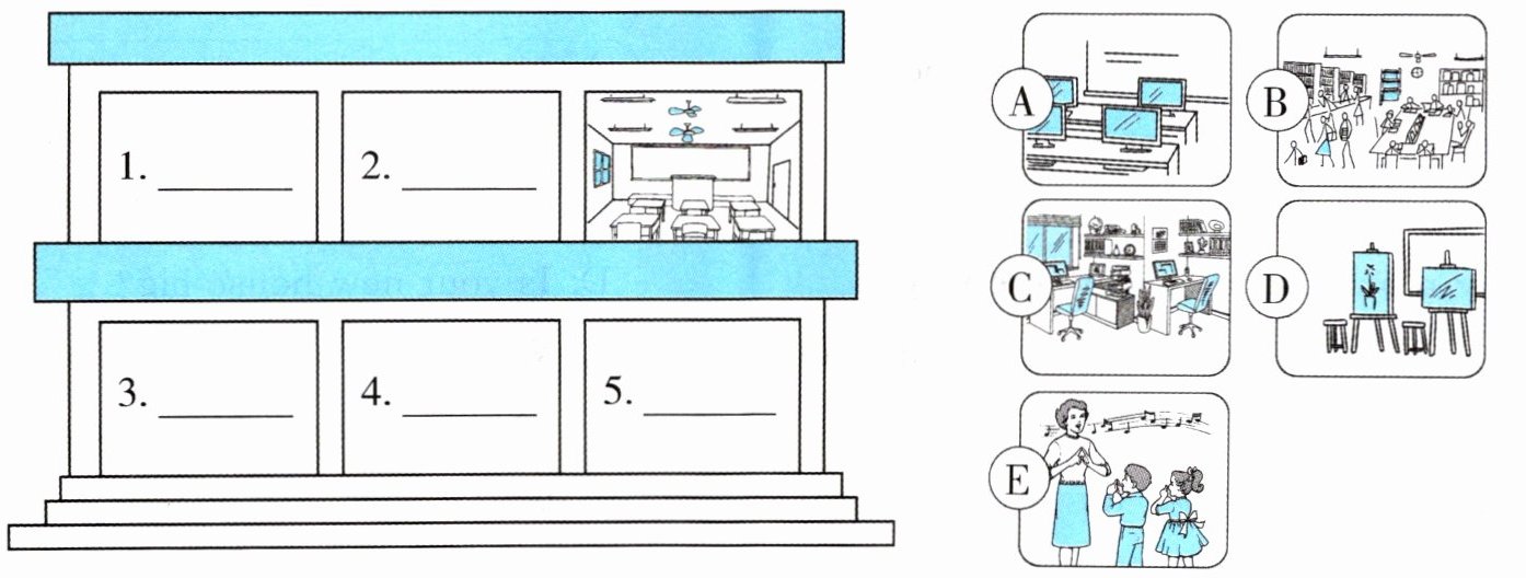 七 新思维 语言运用 请根据 Sue 的介绍完成学校的布局图,将序号填在对应的位置。