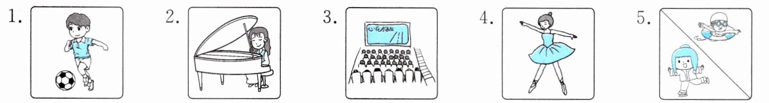 1. play basketball 2. reading stories 3. goes shopping 4. to watch a film 5. drawing pictures 6. a lot of