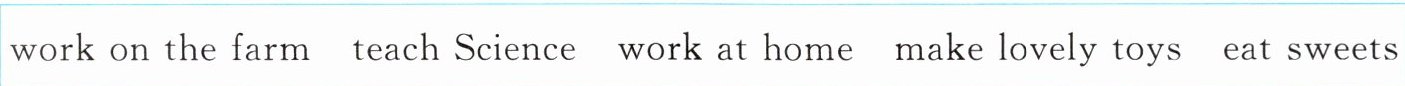 1. teaches Science 2. eating sweets 3. works on the farm 4. to work at home 5. makes lovely toys
