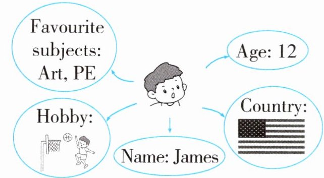 1. James is my new e-friend./James. 2. He lives in the US. 3. He is twelve/12 years old. 4. He likes Art and PE best. 5. He likes playing basketball.