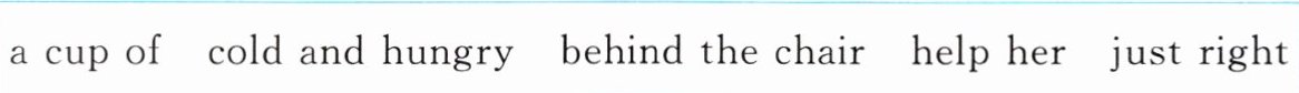 1. just right 2. help her 3. behind the chair 4. a cup of 5. cold and hungry