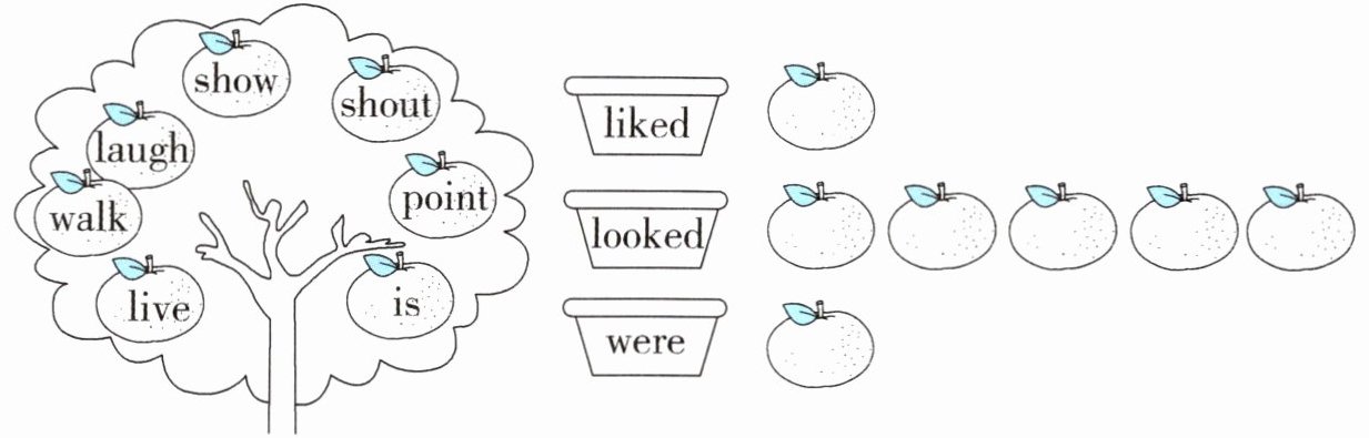一 新思维 语言规律 将树上的果子放入对应的篮子里,并写出其对应动词过去式。