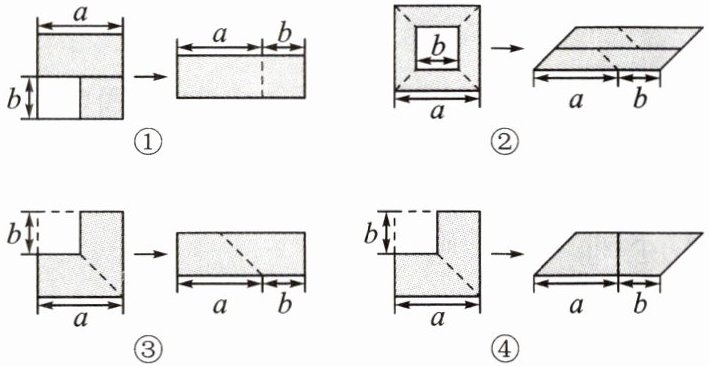 14. 【新考法】如图,阴影部分是在一个边长为 $ a $ 的大正方形中剪去一个边长为 $ b $ 的小正方形后得到的图形,将阴影部分通过割、拼,形成新的图形.给出下列四种割拼方法,其中能够验证平方差公式的有 (