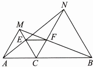 13. 【核心素养·推理能力】如图,点$C为线段AB$上一点,$\triangle ACM$,$\triangle CBN$都是等边三角形,$AN交MC于点E$,$BM交CN于点F$,连结$EF$.求证:
