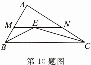 10. (成都外国语学校月考)如图,在$\triangle ABC$中,$\angle ABC和\angle ACB的平分线交于点E$,过点$E作MN// BC交AB于点M$,交$AC于点N$,若$BM + CN = 9$,则线段$MN$的长为(