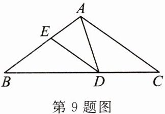 9. 如图,在$\triangle ABC$中,$AB = AC$,$\angle BAC = 108^{\circ}$,$\angle ADB = 72^{\circ}$,$DE平分\angle ADB$,则图中等腰三角形的个数是(