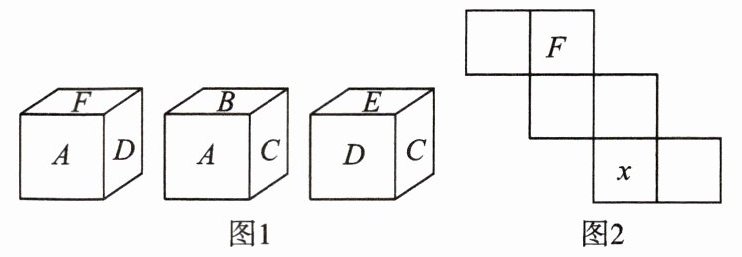 【拓展】一个正方体的六个面分别标有字母 A、B、C、D、E、F,从三个不同的方向看到的情形如图 1 所示,图 2 为这个正方体的侧面展开图,则图中的 x 表示的字母是