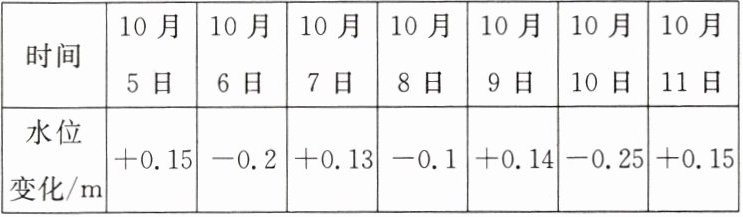 (1)解:这一周内,10月5日的水位最高,是+0.15m,10月10日的水位最低,是−0.13m;10月5日水位位于警戒线之上,距离是0.15m;10月10日水位位于警戒线之下,距离是0.13m.