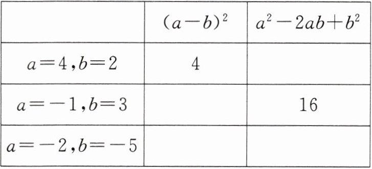 (2)比较表中两代数式的计算结果,请写出$(a - b)^{2}与a^{2} - 2ab + b^{2}$之间有什么关系?