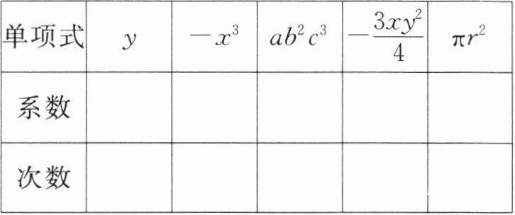 单项式 y -x³ ab²c³ -3xy²/4 πr² 系数 1 -1 1 -3/4 π 次数 1 3 6 3 2