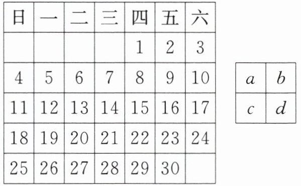 4.(教材第96页“思考·交流”变式)在某月的月历上用正方形圈出a,b,c,d四个数(如图),如果d = 20,那么a + b + c等于(