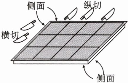 11. (核心素养·应用意识)小明平时常用底面为长方形的模具制作蛋糕,并以平行于模具任一边的方式进行横切或纵切,横切都是从模具的左边切割到模具的右边,纵切都是从模具的上边切割到模具的下边.用这种方式,可以切出数个大小完全相同的小块蛋糕.在切割后,他发现小块蛋糕接触模具的地方外皮比较焦脆,以如图为例,横切 2 刀,纵切 3 刀,共计 5 刀,切出$(2 + 1)×(3 + 1)= 12$个小块蛋糕,其中侧面有焦脆的小块蛋糕共有 10 个,所有侧面都不焦脆的小块蛋糕共有 2 个.