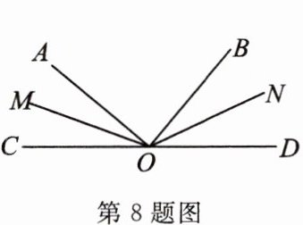 8. (湖北省中考改编)如图所示,$C$,$O$,$D$三点共线,$\angle AOC = 40^{\circ}$,$\angle BOD = 50^{\circ}$,$OM$,$ON分别是\angle AOC$,$\angle BOD$的平分线,则$\angle MON$等于(