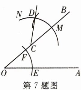 7. 如图,点C在∠AOB的OB边上,用尺规作出了∠BCD = ∠AOB。以下是排乱的作图过程:①以C为圆心,OE长为半径画$\overset{\frown}{MN}$,交OB于点M;②作射线CD,则∠BCD = ∠AOB;③以M为圆心,EF长为半径画弧,交$\overset{\frown}{MN}$于点D;④以O为圆心,任意长为半径画$\overset{\frown}{EF}$,分别交OA,OB于点E,F。则正确的作图顺序是(