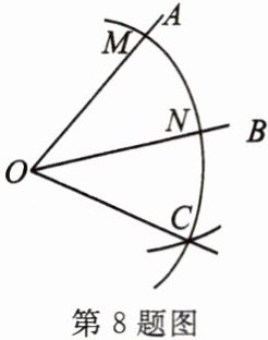 8. 如图,已知∠AOB,用尺规作图如下:①以点O为圆心,任意长为半径画弧,交OA于点M,交OB于点N;②以点N为圆心,MN为半径画弧,交已画的弧于点C;③作射线OC。那么下列角的关系不正确的是(