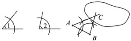 12. 如图,在小龙的一张地图上有A,B,C三个城市,地图上的C城市被墨痕污染了,但知道∠BAC = ∠1,∠ABC = ∠2,请你帮他在图中确定C城市的具体位置。(用尺规作图,保留痕迹,不写作法)
