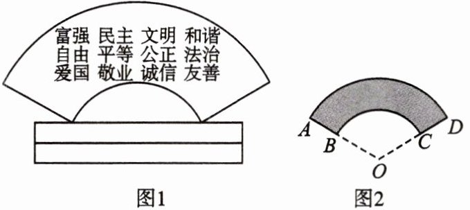 14. (教材第131页习题第2题变式)如图,是一块弘扬“社会主义核心价值观”的扇面宣传展板,该展板的部分示意图如图2所示,它是以O为圆心,OA,OB长分别为半径,圆心角∠O= 120°形成的扇面,若OA= 5m,OB= 3m,则阴影部分的面积是