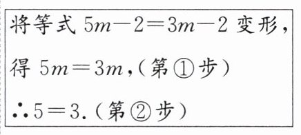 小周同学对等式 $5m - 2 = 3m - 2$ 进行变形,具体过程如表所示: