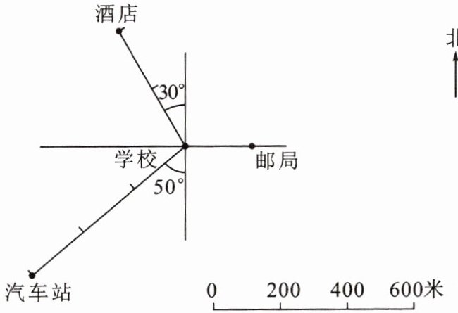 (1)由图知酒店在学校____偏____ ____方向____米处,汽车站在学校____偏____ ____方向____米处;