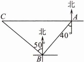 12. (核心素养·应用意识)如图,一艘轮船先从 A 地出发行驶到 B 地,又从 B 地行驶到 C 地,已知 B 地在 A 地南偏西$40^{\circ}$的方向,距离 A 地 80 海里,C 地在 B 地北偏西$50^{\circ}$的方向,距离 B 地 100 海里.