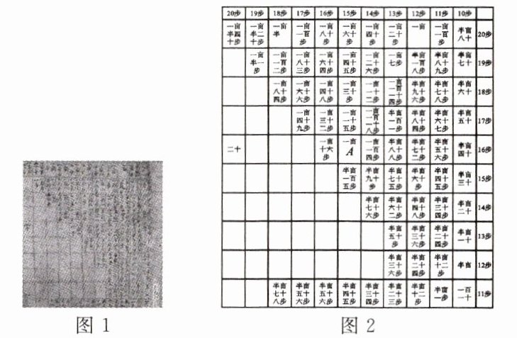 9. (甘肃省中考)敦煌文书是华夏民族引以为傲的艺术瑰宝,其中敦煌《算经》中出现的《田积表》部分如图 1 所示,它以表格形式将矩形土地的面积直观展示,可迅速准确地查出边长 10 步到 60 步的矩形田地面积,极大地提高了农田面积的测量效率. 如图 2 是复原的部分《田积表》,表中对田地的长和宽都用步来表示,A 区域表示的是长 15 步,宽 16 步的田地面积为一亩,用有序数对记为$(15,16)$,那么有序数对记为$(12,17)$对应的田地面积为(