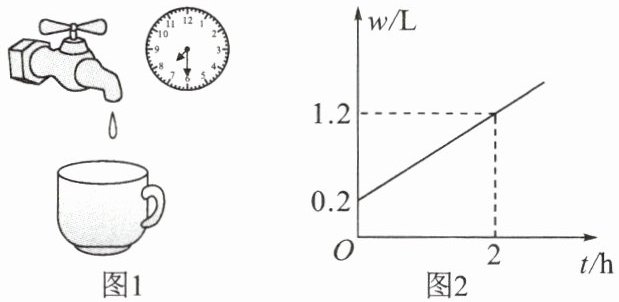 2. 水龙头关闭不严会造成滴水,现用一个含有显示水量的圆柱形水杯接水做如图 1 的试验,研究水杯内盛水量 $ w $(L)与滴水时间 $ t $(h)的关系,根据试验数据绘制出如图 2 的函数图象,结合图象解答下列问题。