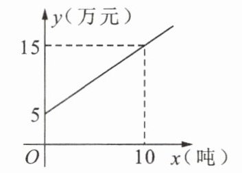 解:设成本 $ y $(万元)与数量 $ x $(吨)之间的关系是 $ y = kx + b $($ k eq 0 $),根据题意得 $ b = 5 $①,$ 10k + b = 15 $②,