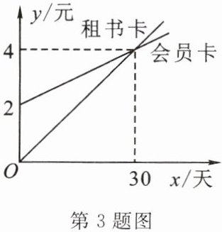 3. 我市图书馆的租书业务有两种方式:会员卡和租书卡,分别使用这两种卡租书的租金$y$(元)与租书时间$x$(天)之间关系如图所示.当租书时间为50天时,采用