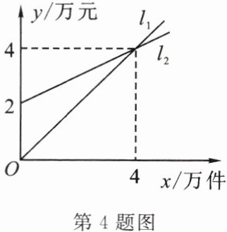 4. 如图,$l_{1}$表示某产品一天的销售收入与销售量的关系;$l_{2}$表示该产品一天的销售成本与销售量的关系,则销售收入$y_{1}$(万元)与销售量$x$(万件)之间的函数关系式为