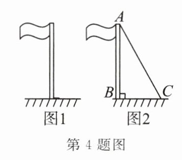 4. 如图,数学兴趣小组要测量学校旗杆的高度,同学们发现系在旗杆顶端的绳子垂到地面并多出一段(如图1),同学们首先测量了多出的这段绳子的长度为1米,再将绳子拉直(如图2),测出绳子末端$C到旗杆底部B$的距离为5米,则旗杆的高度为(