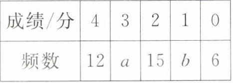 4. (武汉市中考)为加强体育锻炼,增强学生体质,某校在“阳光体育一小时”活动中组织九年级学生定点投篮技能测试,每人投篮4次,投中一次计1分. 随机抽取m名学生的成绩作为样本,将收集的数据整理并绘制成如下的统计图表.