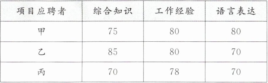 4. (福建省中考)某公司欲招聘一名职员。对甲、乙、丙三名应聘者进行了综合知识、工作经验、语言表达等三方面的测试,他们的各项成绩如下表所示: