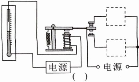 9. 某温度自动报警器的原理图如图所示。电磁铁上端为N极,在水银温度计中封入一段金属丝,当温度低于设定温度时,安全指示灯常亮;当温度达到设定温度时,安全指示灯熄灭,电铃发出报警信号。请在括号中标出电源的极性(用“+”或“-”表示),并在虚线框内填入电铃(Ⓜ)和指示灯的电路元件符号。