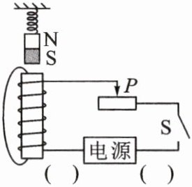 7. 如图所示,在电磁铁上方用弹簧挂着个条形磁体,闭合开关S,条形磁体静止后,滑片P向右滑动时弹簧缩短。请用箭头标出磁感线的方向。并用“+”“-”在括号内标出电源正负极。