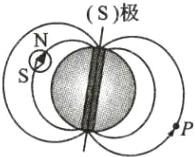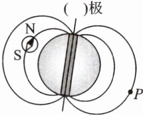 4. 地球是一个天然的大磁体,类似条形磁铁,如图所示为小磁针静止时N、S极的指向,请在图中“( )”处标出地磁场的磁极,并用箭头标出P点的磁感线方向。