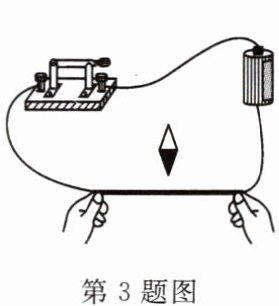3. (陕西省中考)如图所示,将一根直导线架在静止小磁针的上方,并使直导线与小磁针平行,接通电路,发现小磁针偏转。关于该实验说法正确的是(