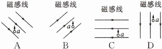 7. (广东省中考)图中的a表示垂直于纸面的一段导线,它是闭合电路的一部分,当a在下列磁场中沿图中所示方向运动时,不会产生感应电流的是(