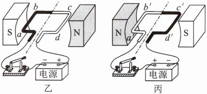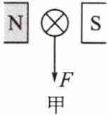 10. [科学推理]如图甲,⊗表示导线中的电流方向垂直于纸面向里,F是磁场对通电导线的作用力。用$F_{ab}、$$F_{cd}、$$F_{a'b'}、$$F_{c'd'}$分别表示图乙、丙中闭合开关时磁场对导体ab、cd、a'b'、c'd'的作用力,则(
