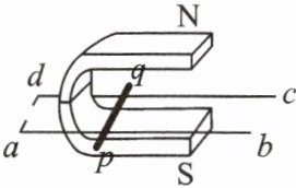 7. (泸州市中考)如图所示,ab、cd两根光滑平行金属导轨固定在同一水平面内,处于蹄形磁铁磁场中的金属杆pq放在导轨上,在外力作用下沿导轨运动。若ad之间断开,则电路中