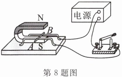 8. 如图所示,闭合开关前,金属棒AB静止不动,闭合开关后,金属棒AB向右运动,这个现象表明,通电导体在磁场中受到