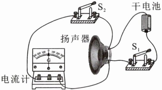 6. [科学论证](辽宁省中考)将扬声器、电池和灵敏电流计等元件连成如图电路。断开 $ S_{2} $,反复快速闭合、断开开关 $ S_{1} $,扬声器发出咔咔声;断开 $ S_{1} $,闭合开关 $ S_{2} $,反复轻敲扬声器的纸盆,会看到电流计的指针左右摆动。下列有关说法正确的是(