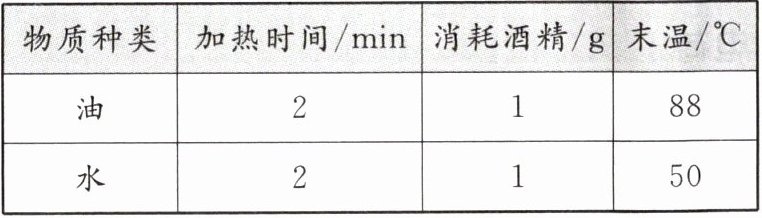 8. (成都市中考)小叶看见面点师傅将面拉成长条,放入滚烫的油中就炸出了香脆可口的油条,于是很想了解油的吸热能力。在老师指导下,他用酒精灯分别加热质量为 50g、初温为 20℃的油和水,记录的相关数据如下表所示。若单位时间内油吸收的热量与水吸收的热量相等,酒精的热值为$ 3×10^{7}J/kg,水的比热容为 4.2×10^{3}J/(kg·℃)。$下列说法正确的是(