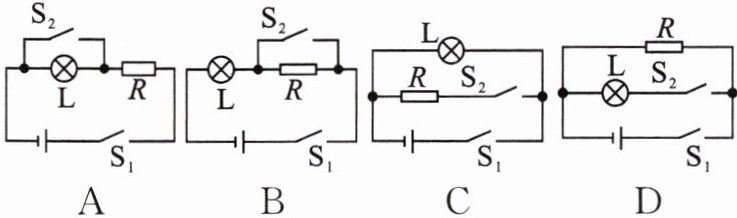 4. (烟台市中考)为了交通安全,驾驶员必须系好安全带。某汽车厂家为了提醒驾驶员系好安全带,做了如下设计:驾驶员坐上驾驶座位未系安全带时,开关$S_{1}$闭合,提示灯亮;系上安全带后,开关$S_{2}$也闭合,提示灯灭。下列所示的四个选项中,符合电路设计要求的是(