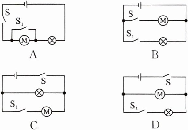 6. (遂宁市中考)图中的电动独轮车依靠电力驱动,低碳环保。当电源开关$S$闭合时指示灯亮起,独轮车处于待机状态,当人站在独轮车上时开关$S_{1}$自动闭合,电动机工作,独轮车才开始运动。下列电路设计符合上述要求的是(